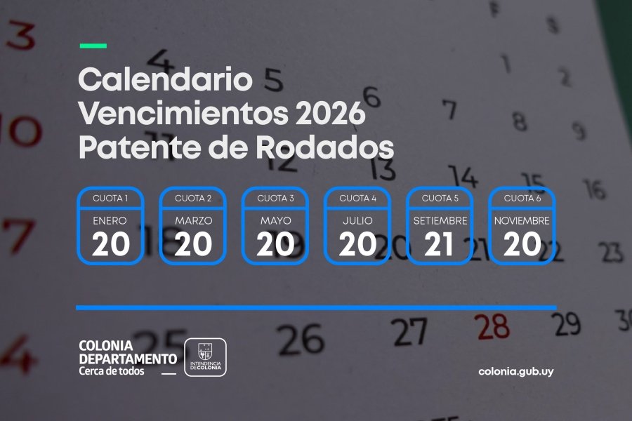 La Intendencia de Colonia informó el calendario de vencimientos para el pago de la Patente de Rodados correspondiente al ejercicio 2026, así como los beneficios por pago contado y por abonar las cuotas en fecha.
