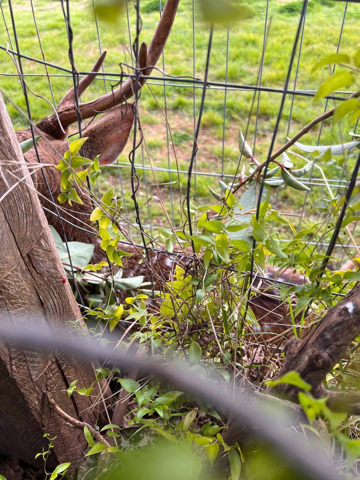 Colonia, 18/08/2025. En la zona del kartódromo de Colonia del Sacramento, vecinos encontraron este lunes a un ciervo que había quedado atrapado en un tubo de tejido metálico.