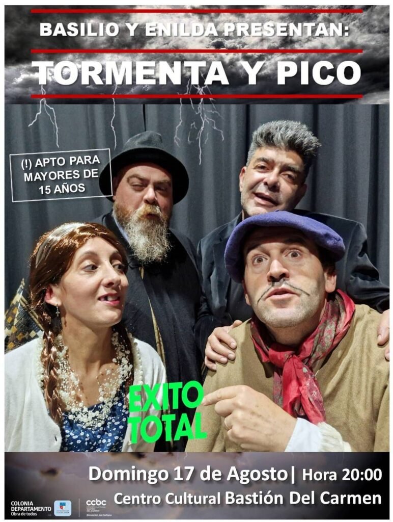 Colonia del Sacramento, 17 de agosto de 2025 – A pedido del público, los entrañables personajes Don Basilio y la Enilda vuelven al Centro Cultural Bastión del Carmen con su nueva obra “Tormenta y Pico”, este domingo a las 20:00 horas.