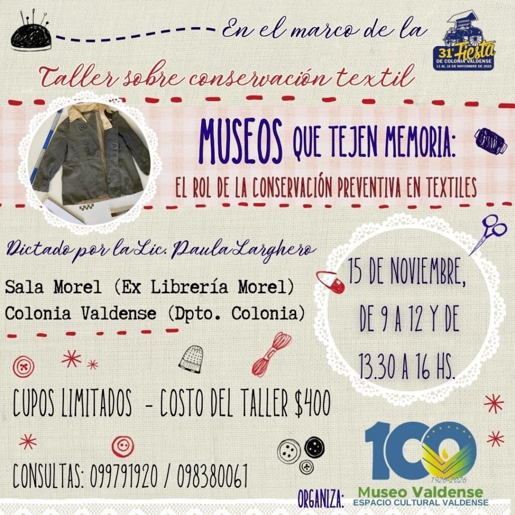 En el marco de la 31ª Fiesta de Colonia Valdense se realizará el taller “Museos que tejen memoria: el rol de la conservación preventiva en textiles”, orientado a la preservación y cuidado de piezas textiles como parte del patrimonio cultural.